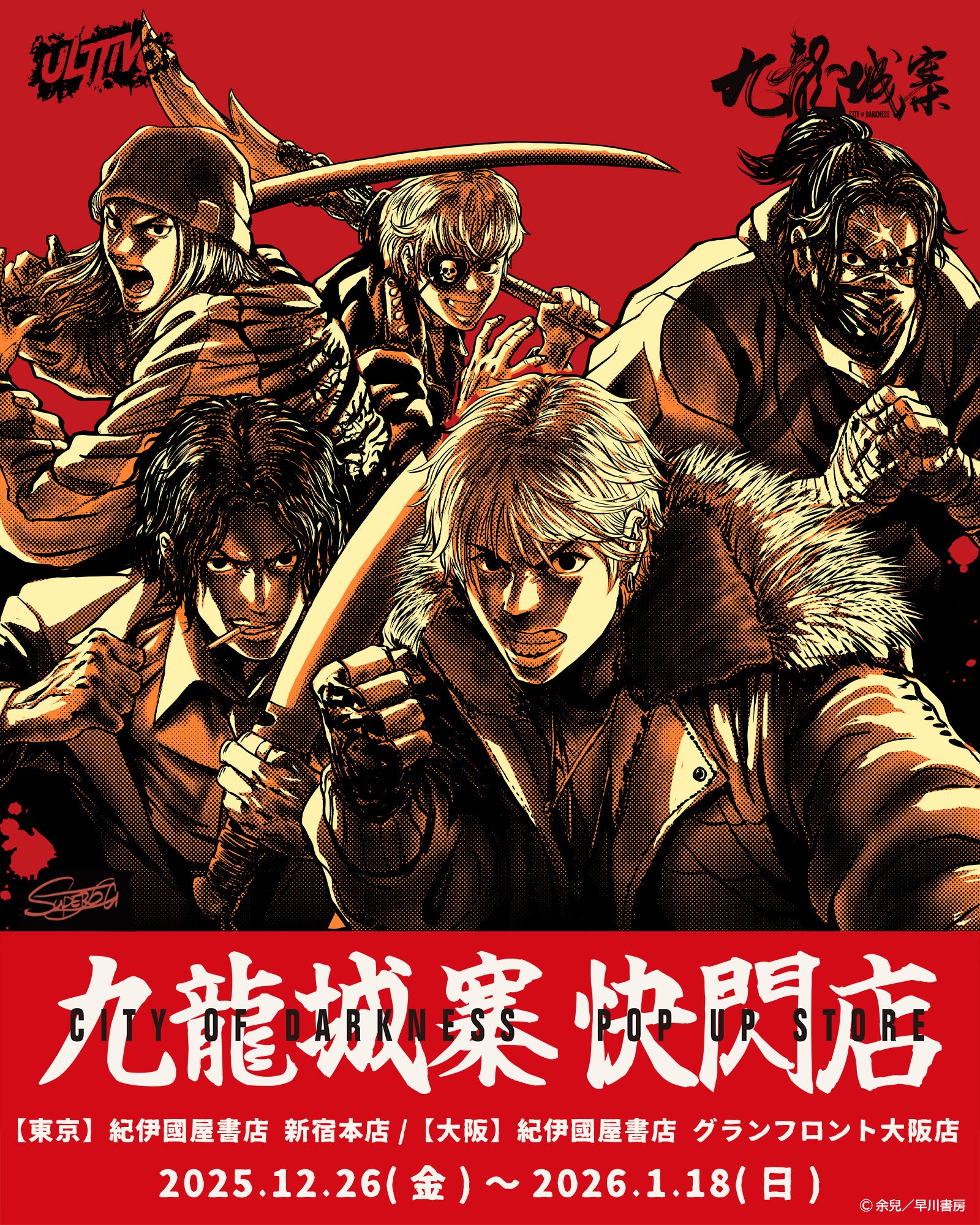 明日12/26(金)より紀伊國屋書店 新宿本店と紀伊國屋書店 グランフロント大阪店にて開催される『九龍城砦』POP UP STOREにて、ポスターやグッズのイラストを担当したイラストレーター、スーパーログ先生のサイン会を開催いたします。 イラストレーター スーパーログ先生 サイン会 【大阪】2026年10月12日(月祝) 18:00~ 【会場】紀伊国屋書店 グランフロント大阪店 店内中央イベントコーナー https://store.kinokuniya.co.jp/event/1766389553/ 【東京】2026年1月18日(日) 13:00~ 【会場】紀伊國屋書店 新宿本店 9Fイベントスペース https://store.kinokuniya.co.jp/event/1766397517/ 【対象商品】・「九龍城砦 シルクスクリーンポスター」税込16,500円・「トワイライト・ウォリアーズ 決戦!九龍城砦 シルクスクリーンポスター」税込13,200円 【参加方法】 ・POP UP STORE会期中、東京、大阪の両会場にて対象商品をご購入のお客様に先着順でサイン会整理券を配布いたします。既定の枚数に達し次第、配布は終了いたします。 ・当日はご購入いただいたポスターと[サイン会整理券]を必ずご持参ください。お忘れの場合はイベントにご参加いただけません。 ・サイン対象のポスターは上記2点です。いずれか1点のみでもサイン会にご参加いただけます。(2点ご購入の場合は両方にサインをお入れいたしますので、ご希望のお客様は当日会場に2点ともご持参ください。)...